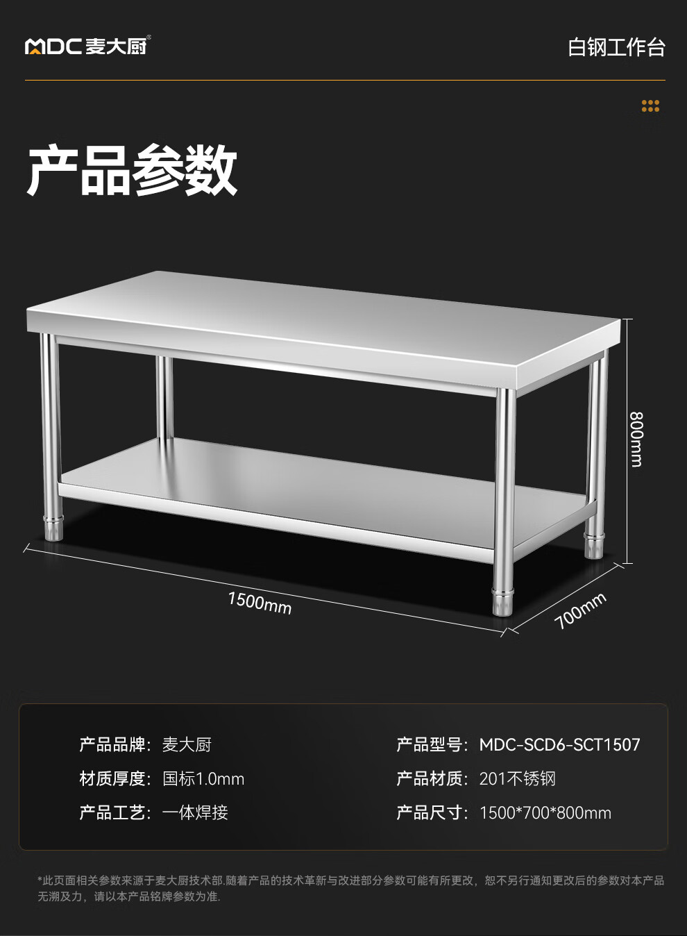 首頁 > 商廚產(chǎn)品 > 工作臺 > 雙層工作臺 >麥大廚1.5m升級款不銹鋼工作臺打荷臺雙層工作臺